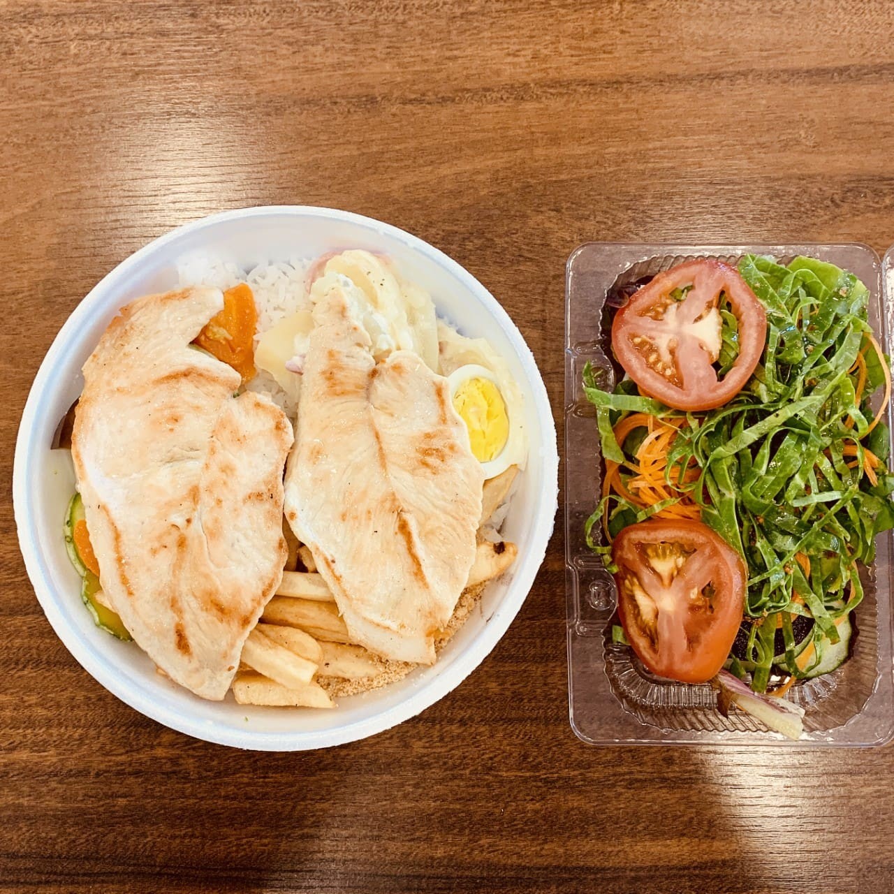 Arroz branco ou integral, feijão preto, legumes grelhados, spaghetti sugo, filé de frango grelhado ou milanesa, farofinha da casa, batata frita e salada.