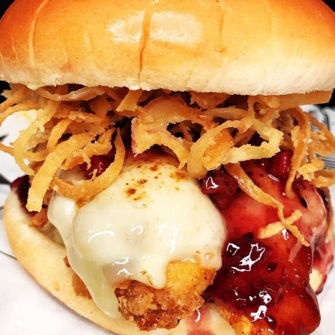 Frango Crocante, mussarela, gelia de frutas vermelhas com bacon, cebola crocante e maionese.