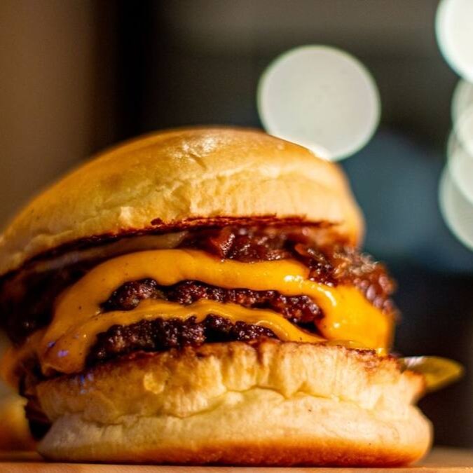 2 Burges de 90 gramas prensados na chapa, servidos com cheddar, picles, cebola caramelizada e maionese do herys