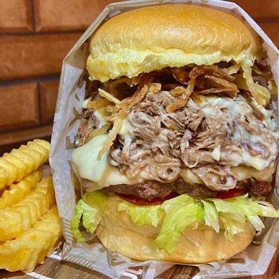 Um hambúrguer suculento de 150g, recheado com suculenta costelinha de porco desfiada e coberto com queijo mussarela derretido. Acompanhado de cebola crocante, molho barbecue defumado e uma cremosa maionese, proporcionando uma explosão de sabores irresistíveis.