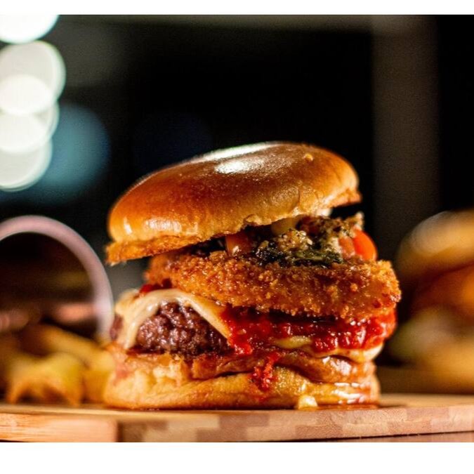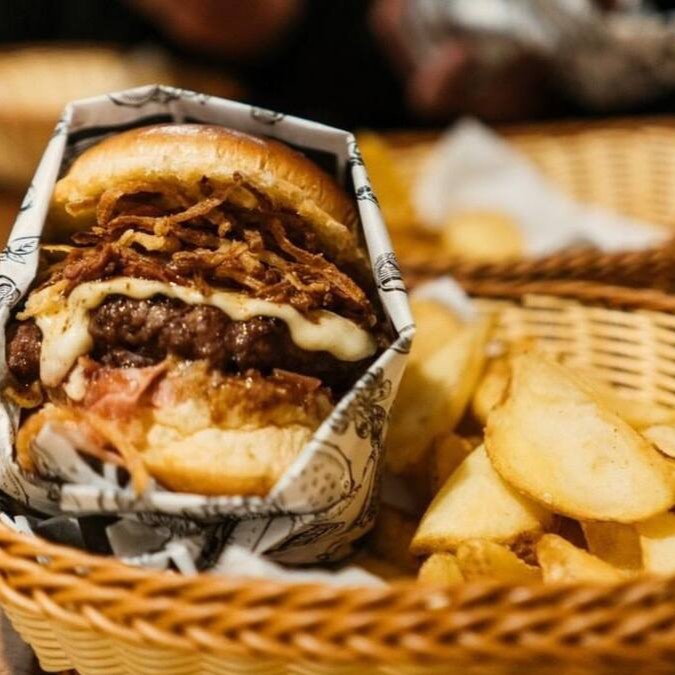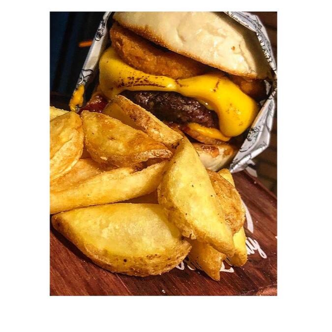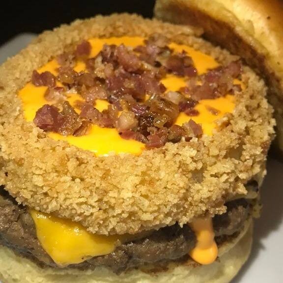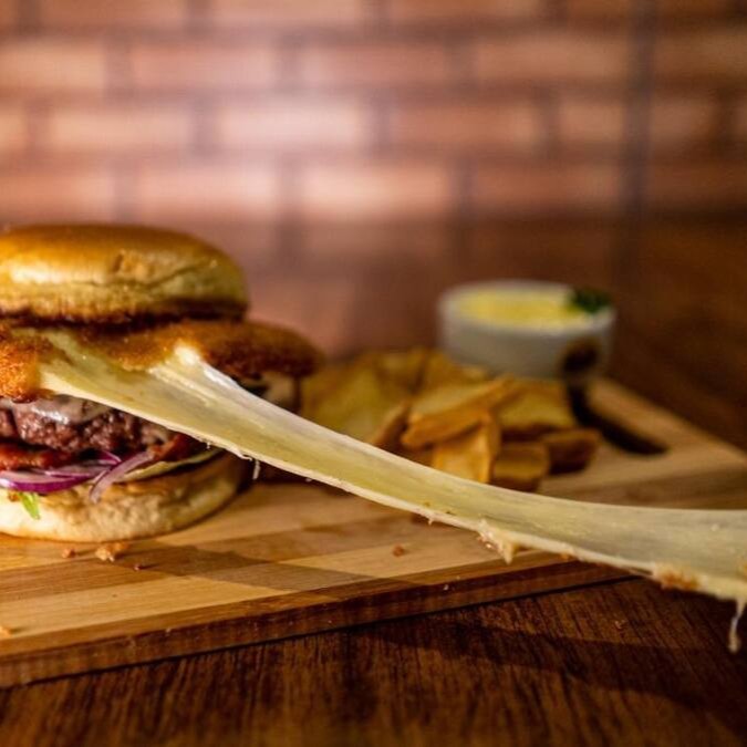 Burger suculento de 150g, coberto com queijo cheddar derretido, bacon crocante, anéis de cebola empanados e finalizado com um saboroso molho do Herys