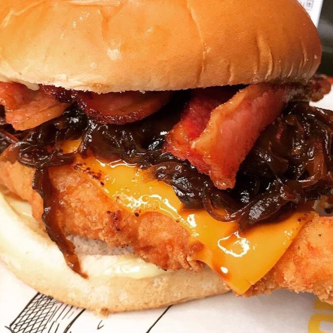 Frango Crocante, Cheddar, cebola caramelizada, Barbecue, bacon e maionese.