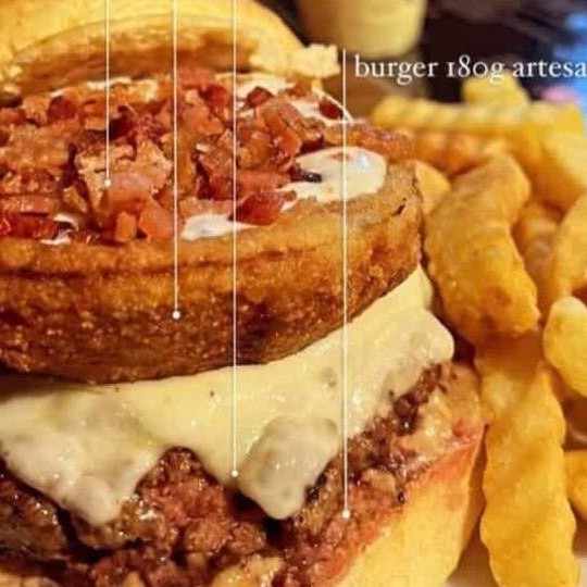 Burger de 180g, onion artesanal, molho cremoso de gorgonzola, molho especial e bacon triturado.