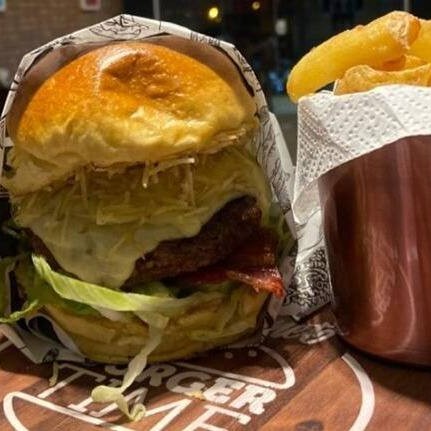 Burger 150g, mussarela, Catupiry, alface, bacon, batata palha artesanal e maionese do herys.