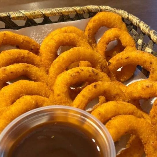 Anéis de cebola fritos servidos com nosso molho barbecue