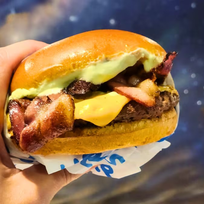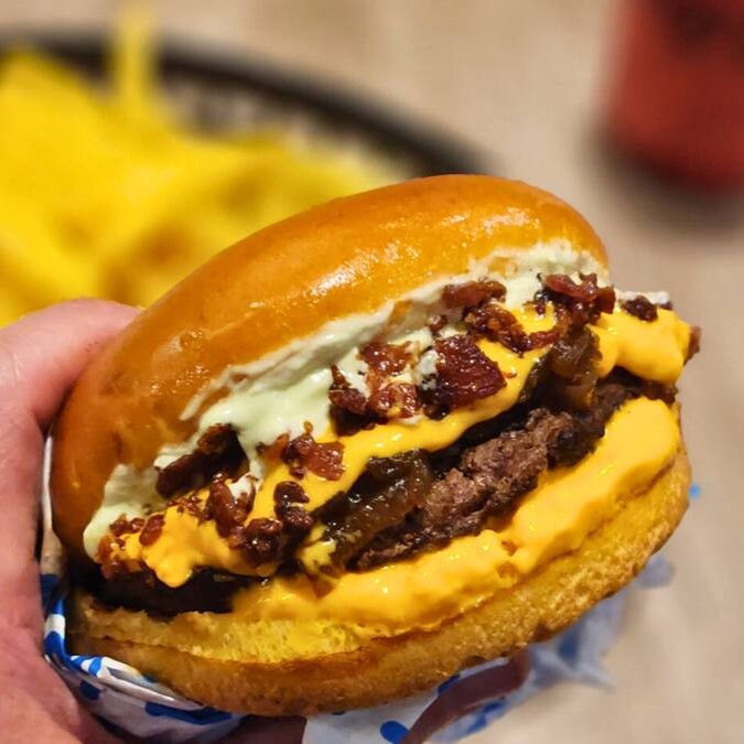 Pão brioche selado, burger 160g in natura, Receita Original de Queijo Cheddar melt e Cebola Caramelizada, Farofa de Bacon e nossa irresistível Maionese verde da casa.