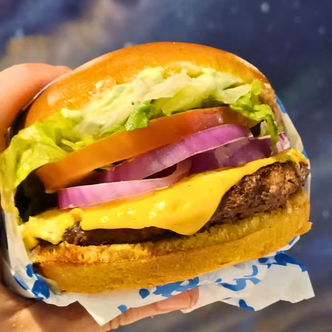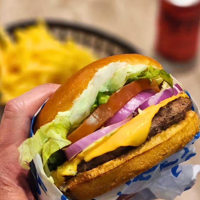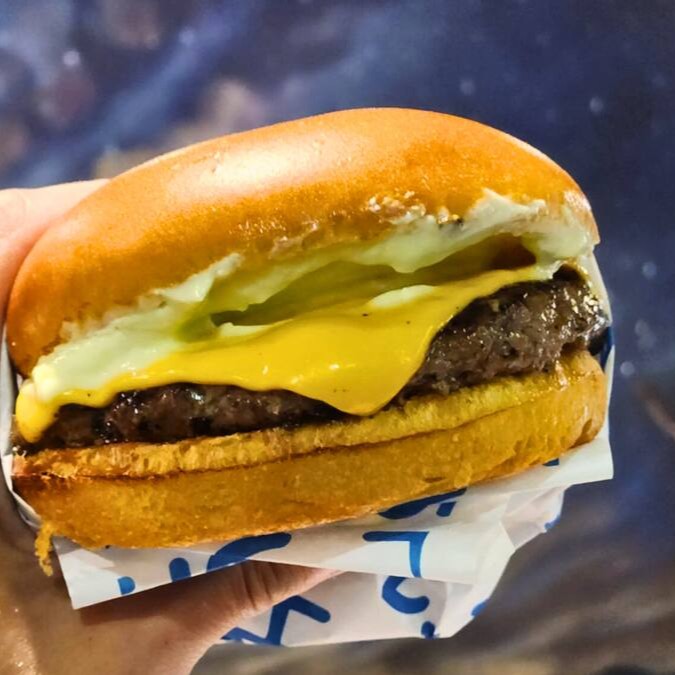 Pão brioche selado na manteiga, burger 160g in natura, Dobro de queijo cheddar fatiado e nossa irresistível Maionese verde da casa.