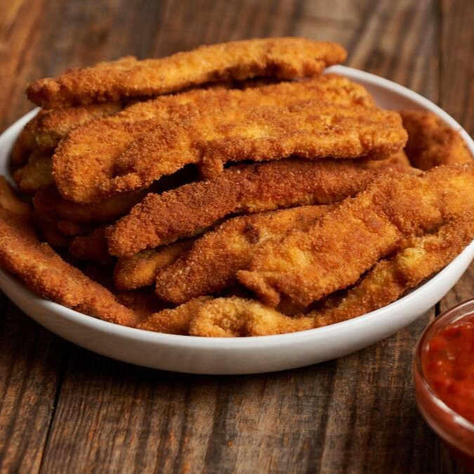 Experimente saborear o seu Hev preferido com esse acompanhamento sensacional sugerido pela casa. Tiras de peito de frango frito, empanados em farinha panko e levemente temperados para preservar o sabor da carne.