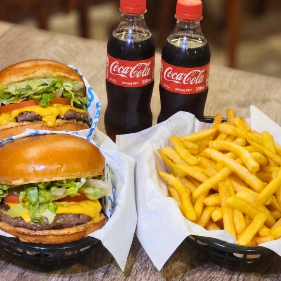 Pão brioche selado, 3 smash de 90g totalizando 270g de carne in natura em cada hamburguer, queijo cheddar fatiado original e nosso irresistível maionese da casa. + 1x batata dupla + 2 Coca-Cola 200ml