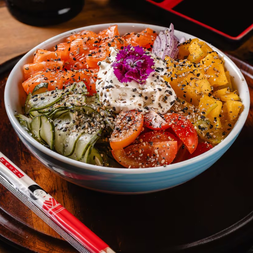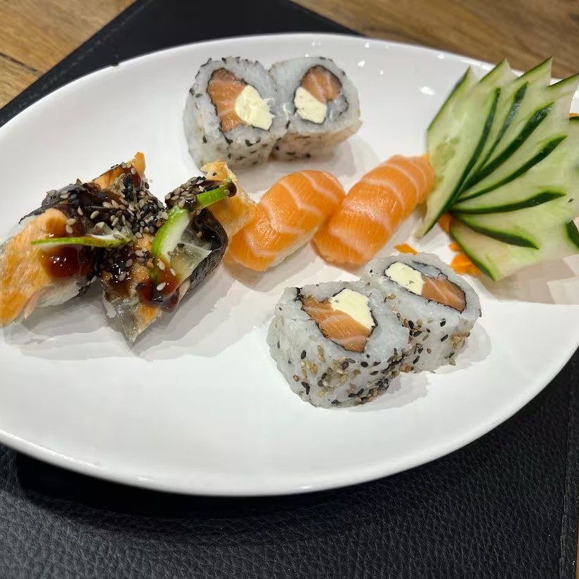 Salmão ,creemcheese,arroz,sunomono,manga ,cebola roxa e tomate