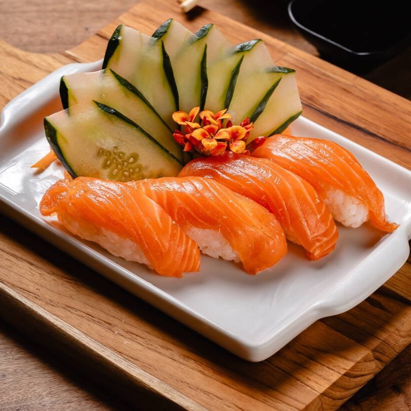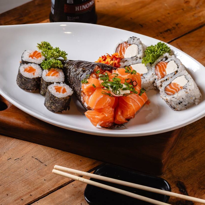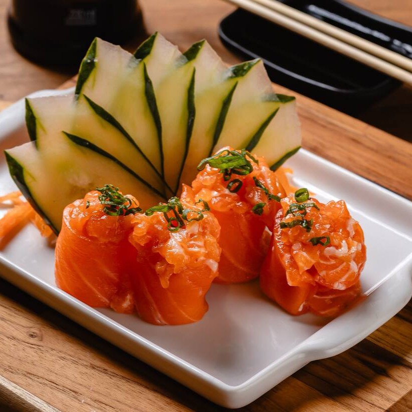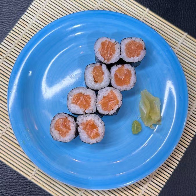 Sushi em formato de rolinho fino, onde o arroz e a alga nori envolvem um recheio de Salmão
