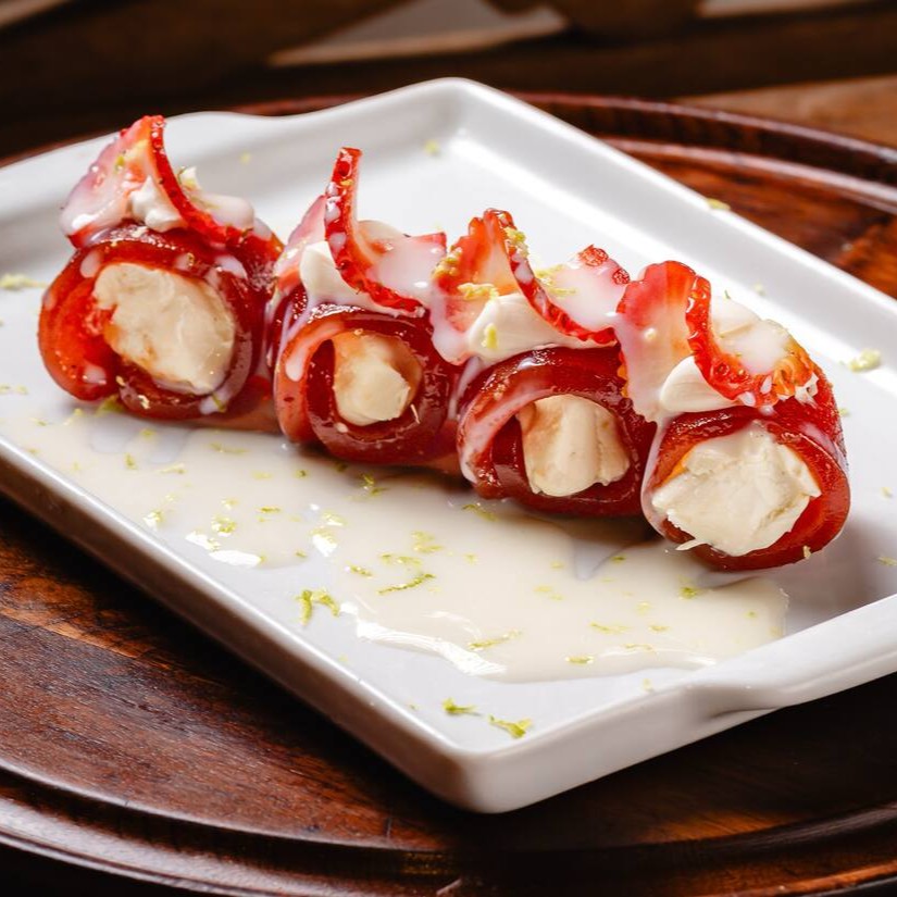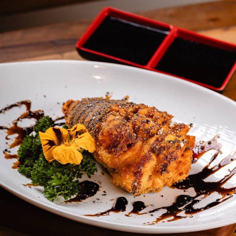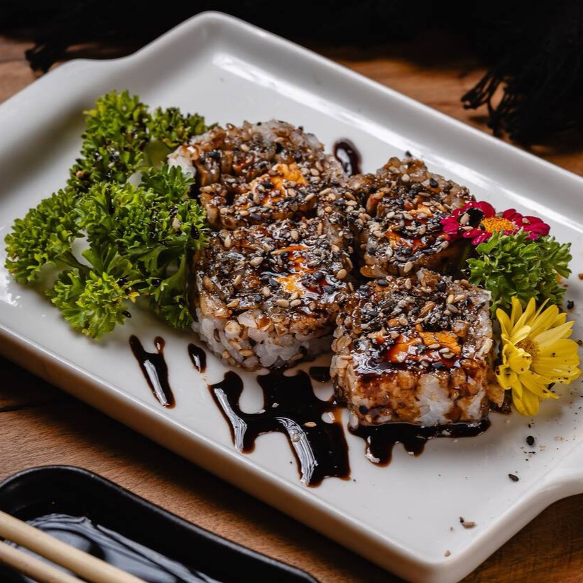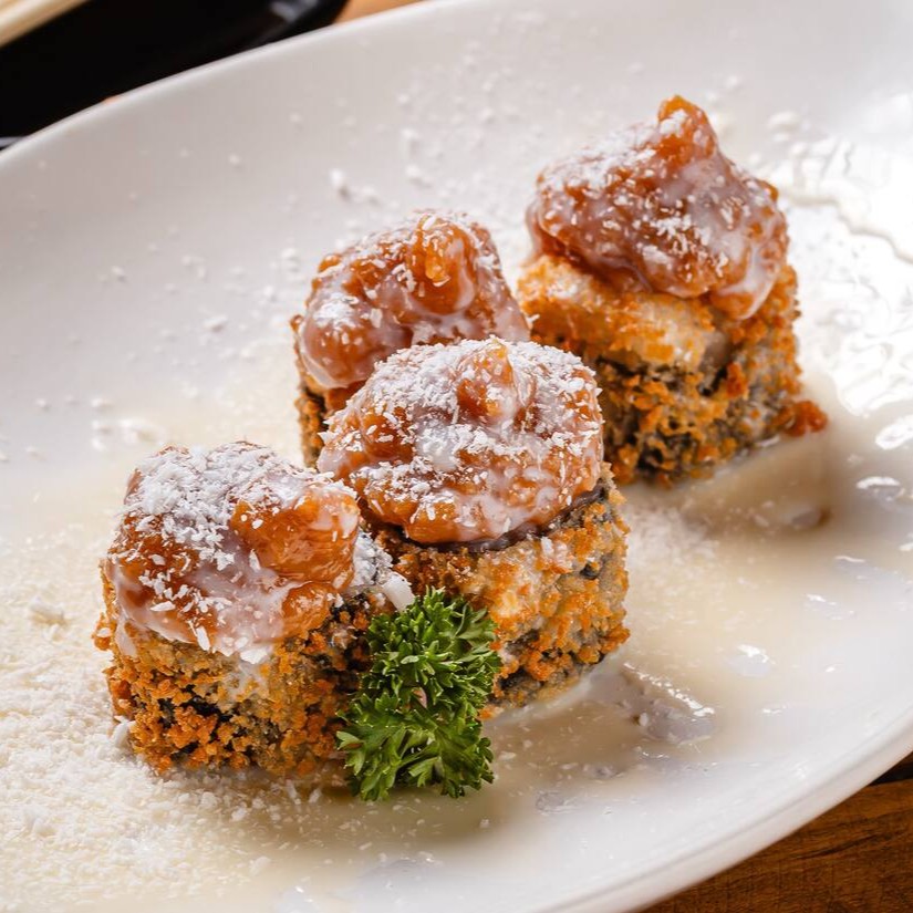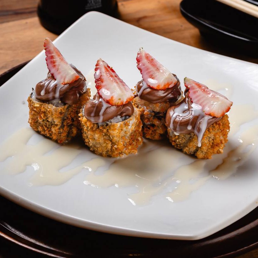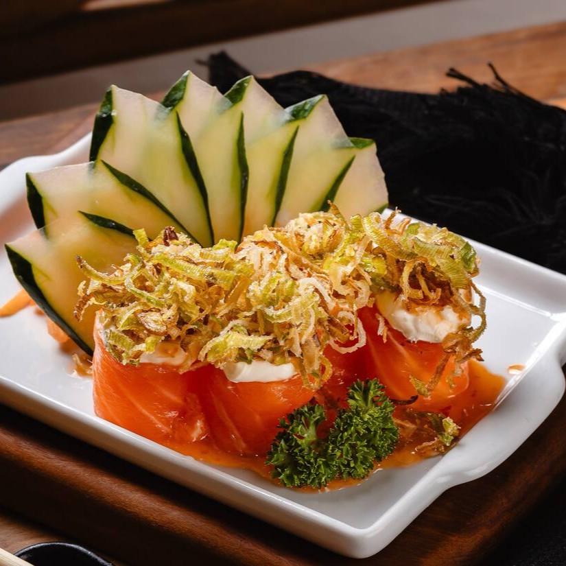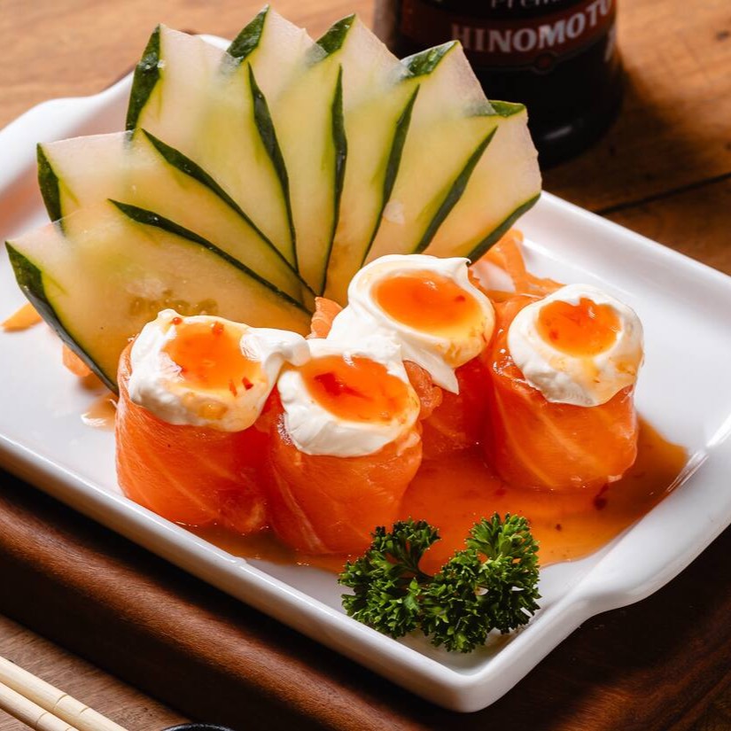 Empanado e frito, que consiste em um enrolado de alga (nori), arroz, salmão e cream cheese, empanado em farinha panko e frito