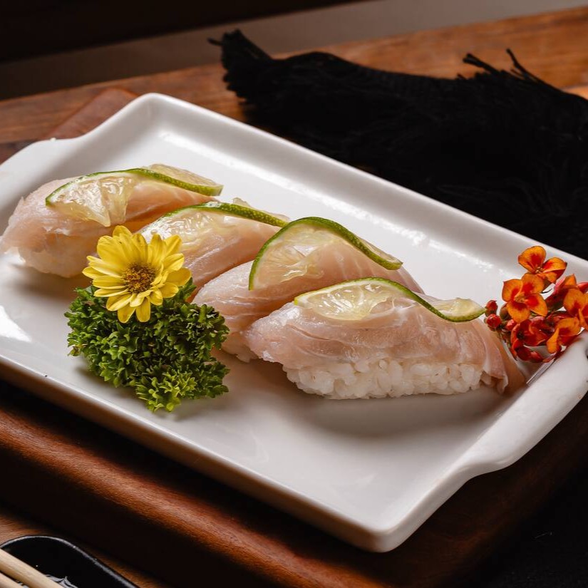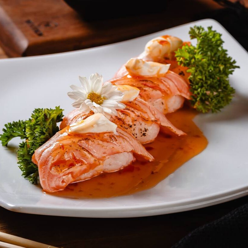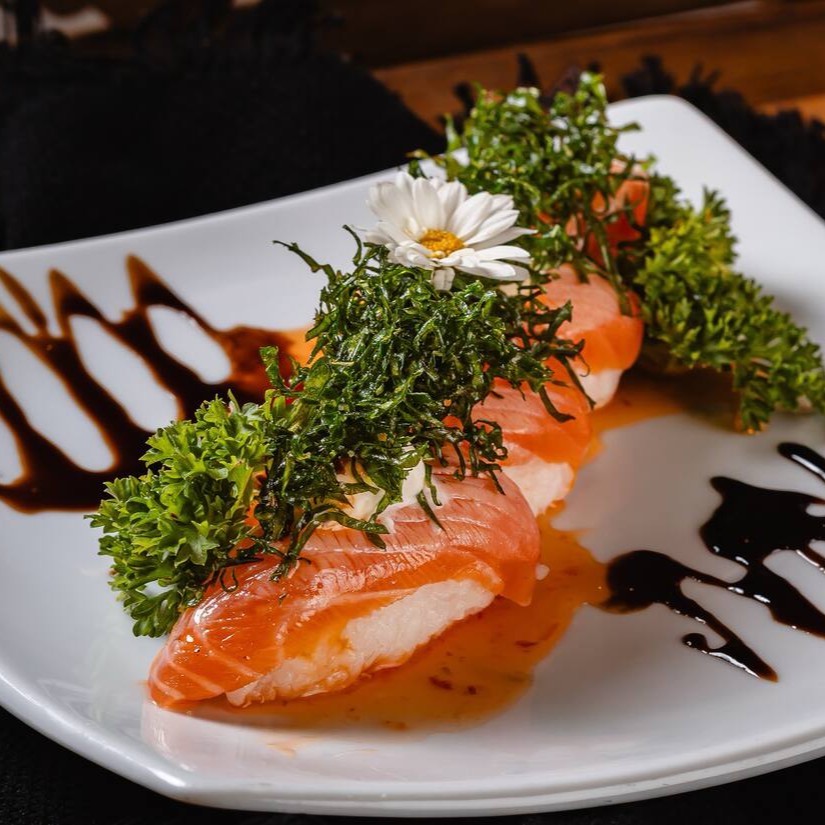 Fatia de peixe fresco sobre arroz japonês temperado, finalizado no estilo tradicional japonês.