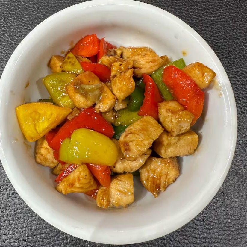 Peito de frango + pimentão de verde + pimentão vermelho.