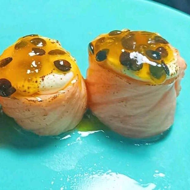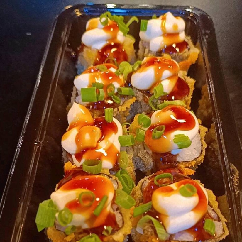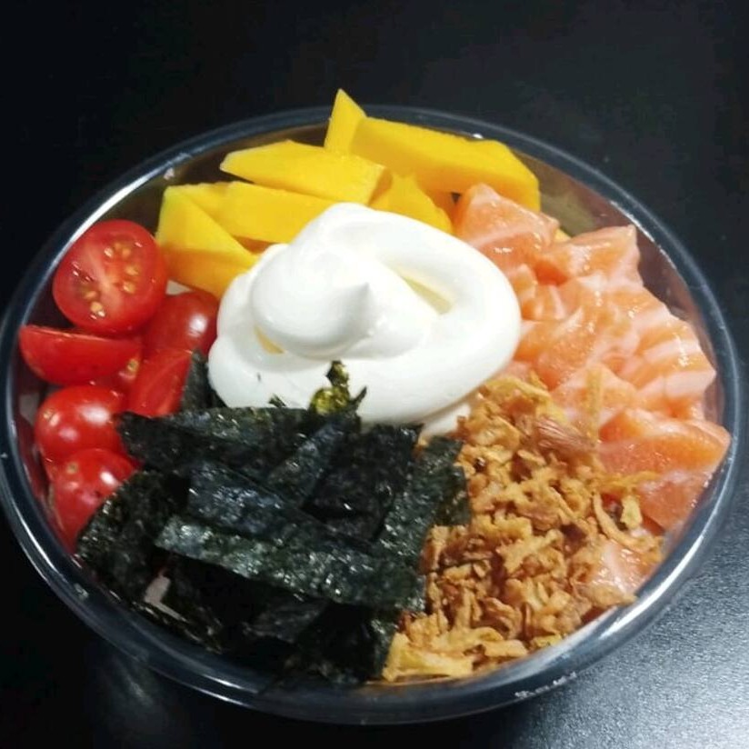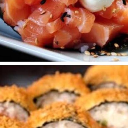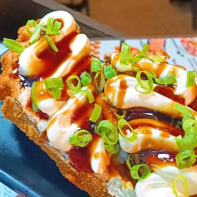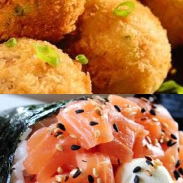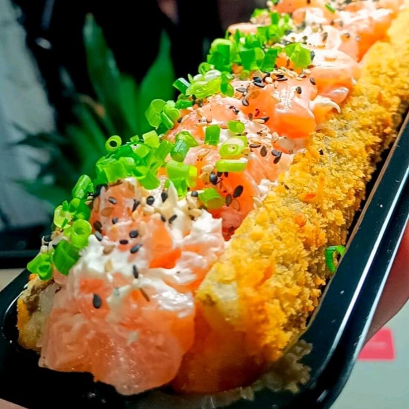 Arroz, creme cheese,nori, salmão, manga e cebola crispy e tomate cereja.
