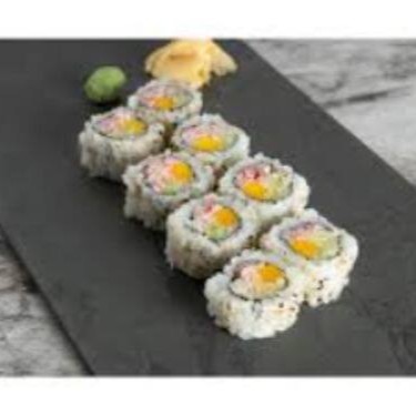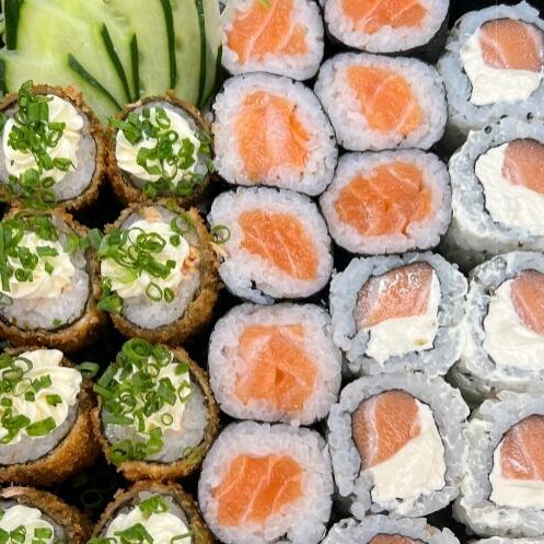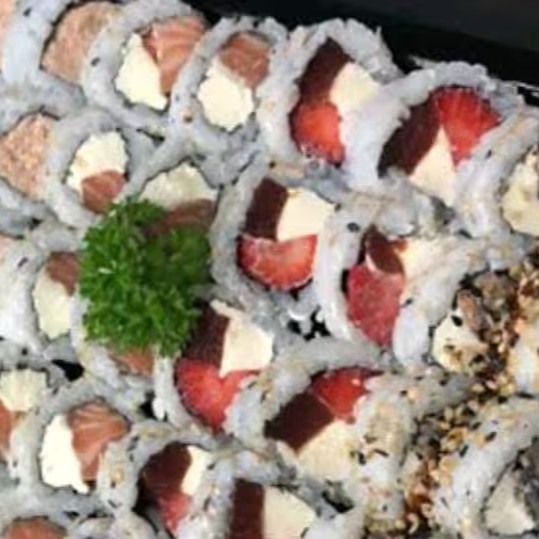 Arroz , cream cheese , salmao, pepino, manga, cebola roxa e kani.