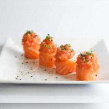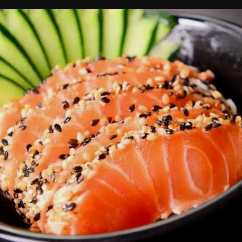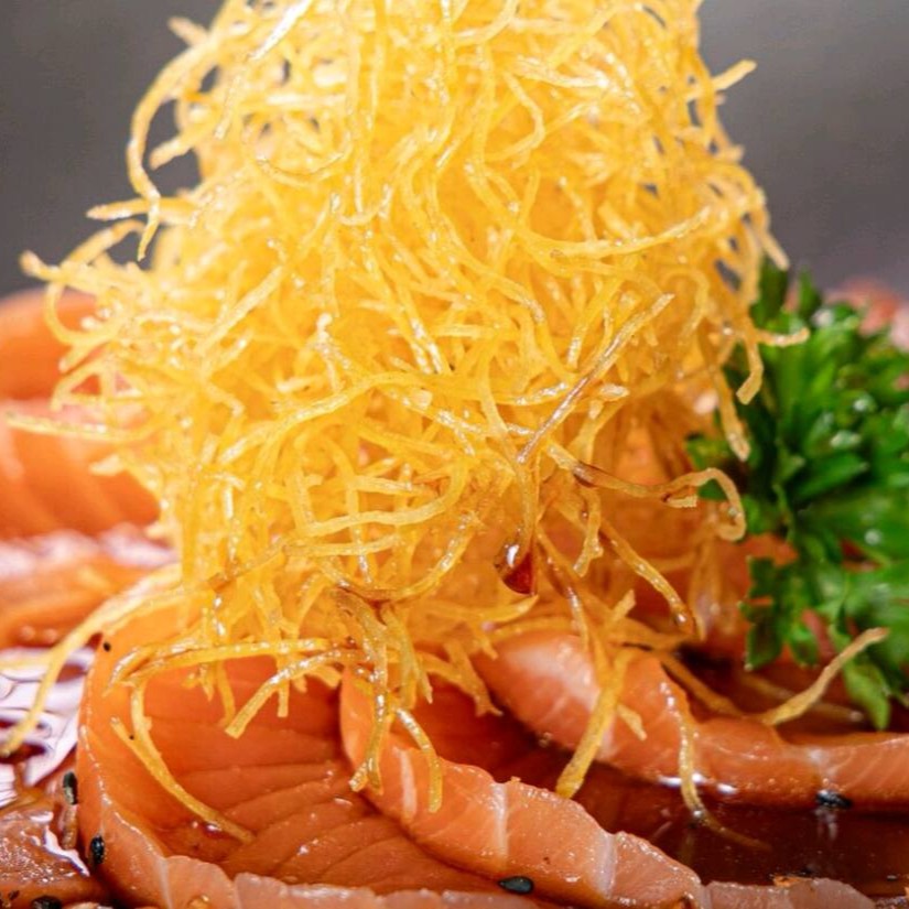 14 lâminas de salmão com crispy de batata doce e molho tataki