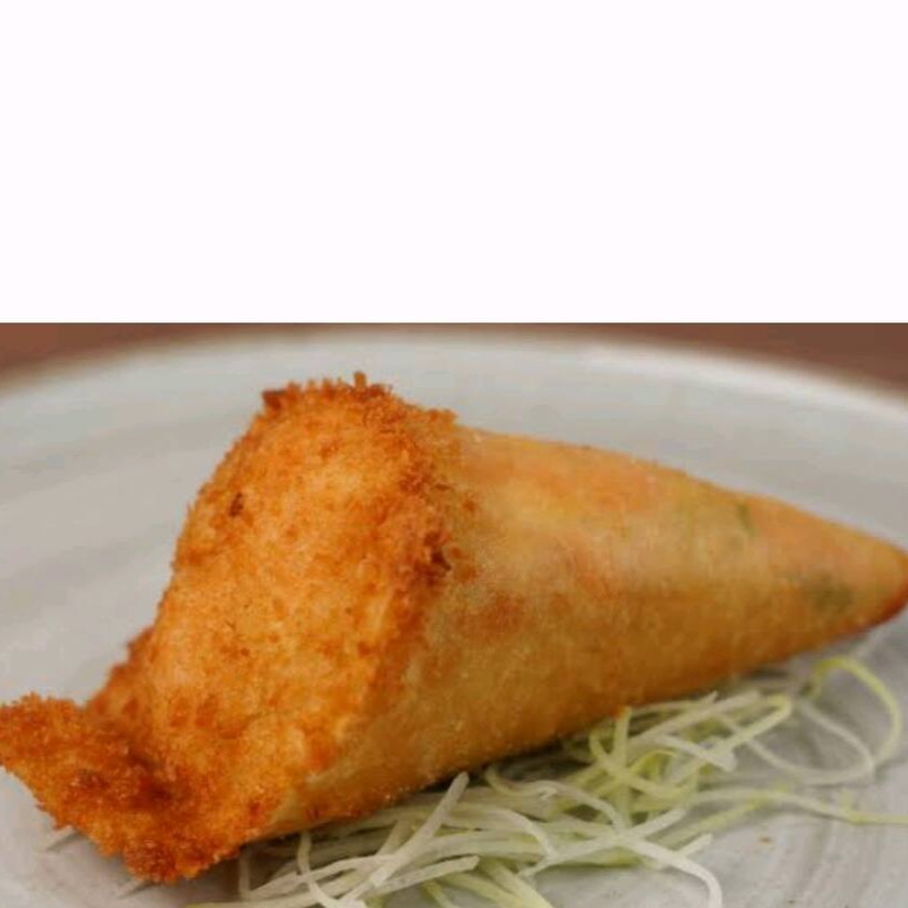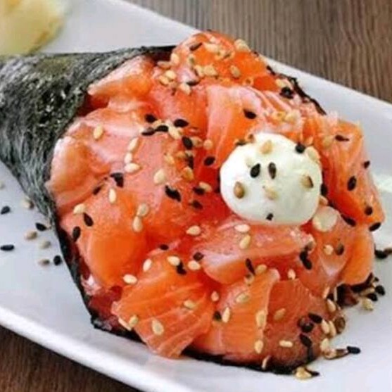 Massa de harumaki em formato de cone recheado com Salmão e crêem cheese.