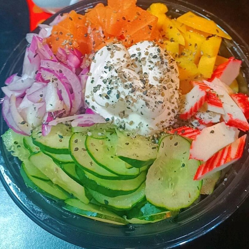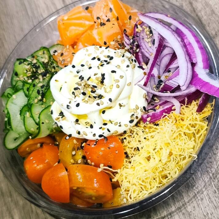 Arroz,crean, cheese, Salmão, sunomono, crispy de batata doce, tomate cereja, cebola roxa e gergelim.