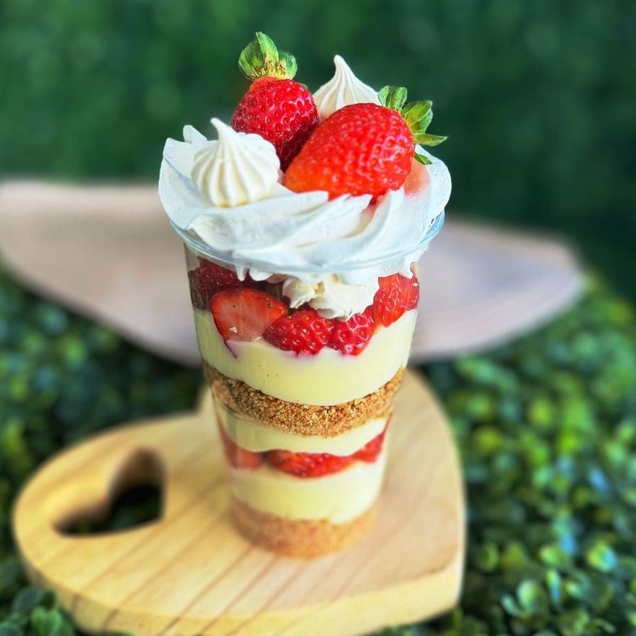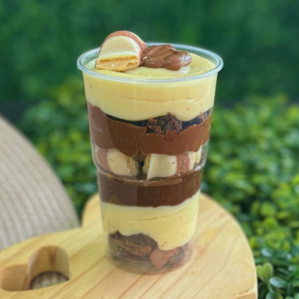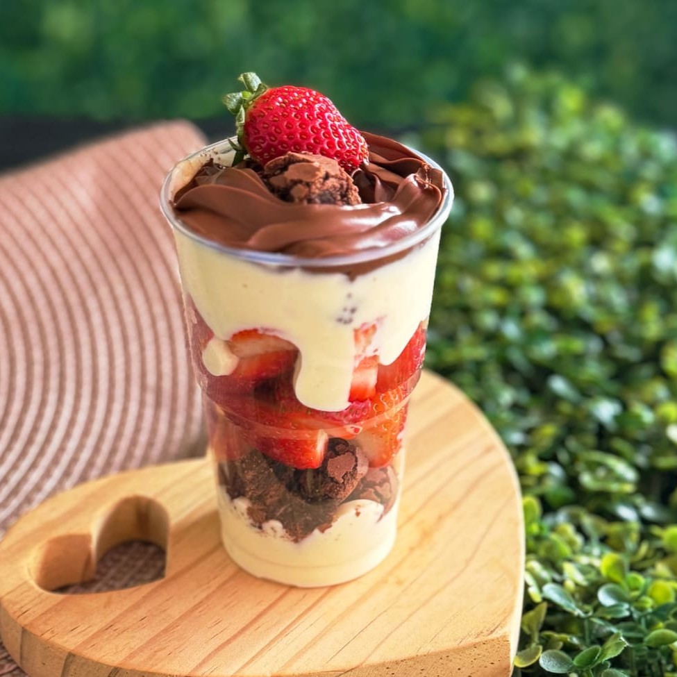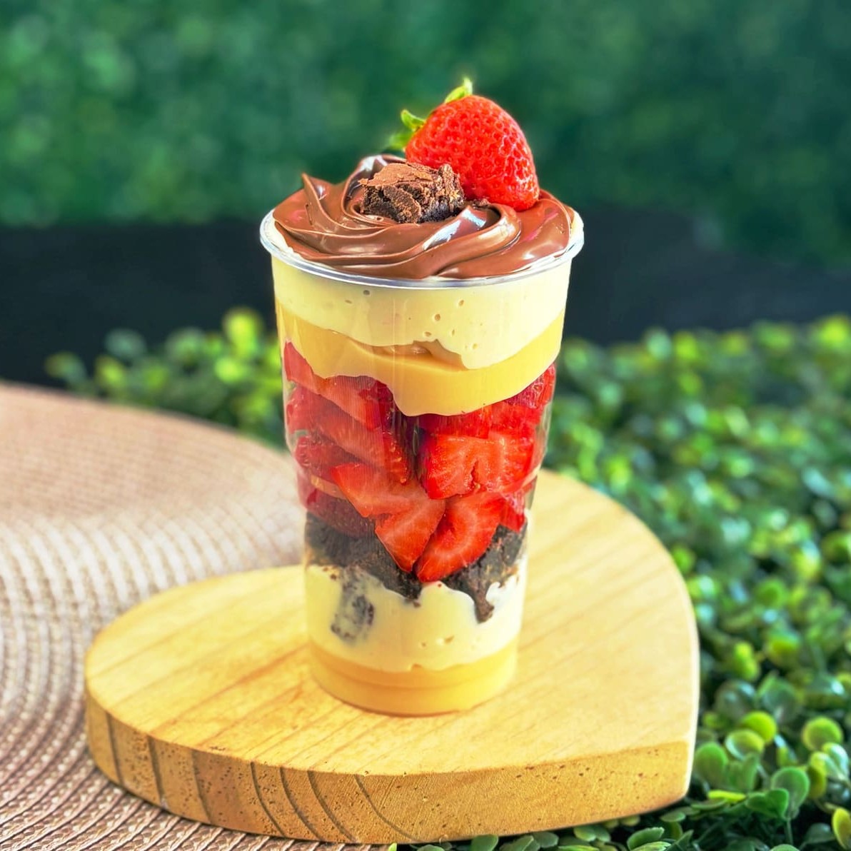 Farofa de bolacha amanteigada, brigadeiro de Ninho cremoso, morangos, finalizado com suspiro e chantininho. A loja não altera, adiciona ou retira ingredientes de nenhum produto. Produto artesanal, de consumo imediato.