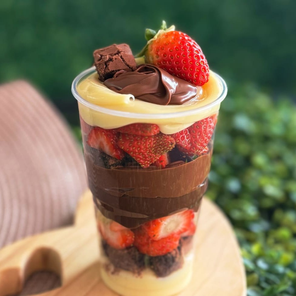 Brownie, brigadeiro de Ninho, morango, brigadeiro cremoso ao leite e Nutella. A loja não altera, adiciona ou retira ingredientes de nenhum produto. Produto artesanal, de consumo imediato.