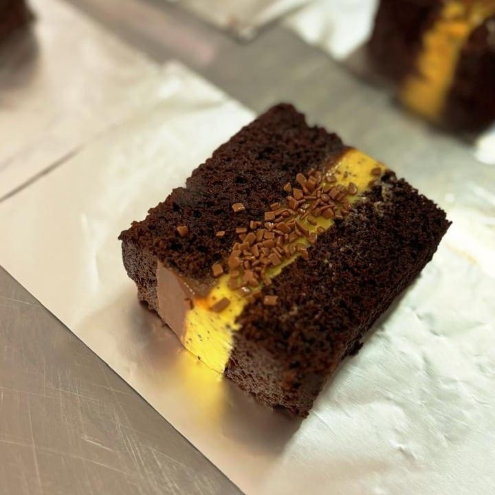Bolo de chocolate molhadinho, recheado com brigadeiro super cremoso de maracujá e recheio de brigadeiro ao leite.
