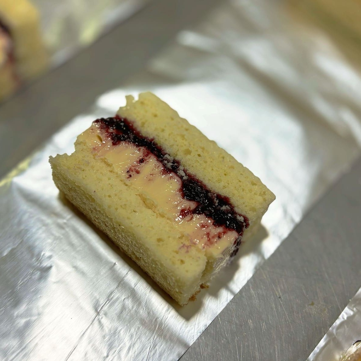 Bolo branco molhadinho, recheado com brigadeiro de Ninho cremoso e geleia artesanal de frutas vermelhas.