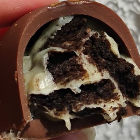 Um delicioso trufão feito com chocolate 100% ao leite de linha premium, junto a um cremoso brigadeiro branco gourmet com pedaços inteiros de Oreo. Paixão à primeira vista. ***Nossos trufões têm o tamanho de 2 trufas tradicionais e são generosamente recheados***