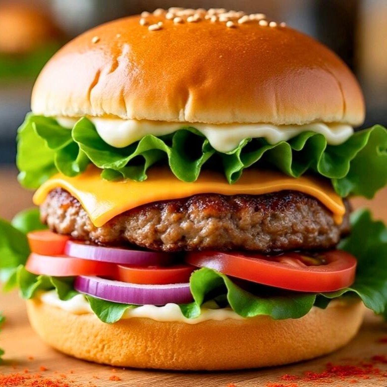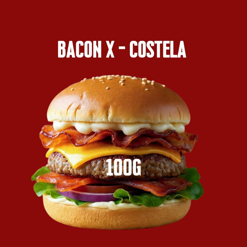 Pão , maionese, alface,tomate,cebola, queijo cheddar, 1 Hamburguer artesanal com 100 gramas de carne costela ,bacon em cubos.