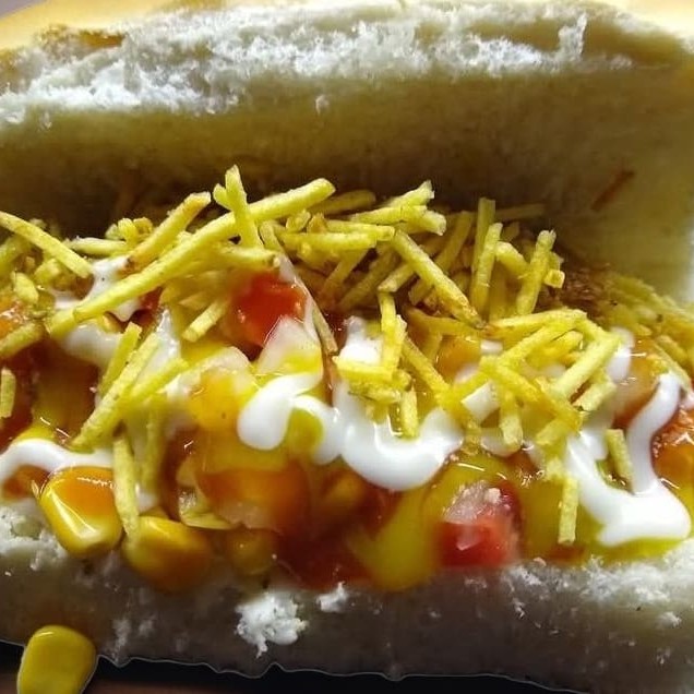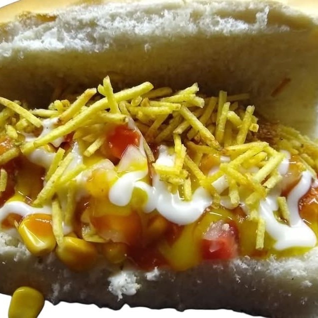 Pão, 1 salsicha, maionese ,tomate,cebola, milho, farofa, batata palha.