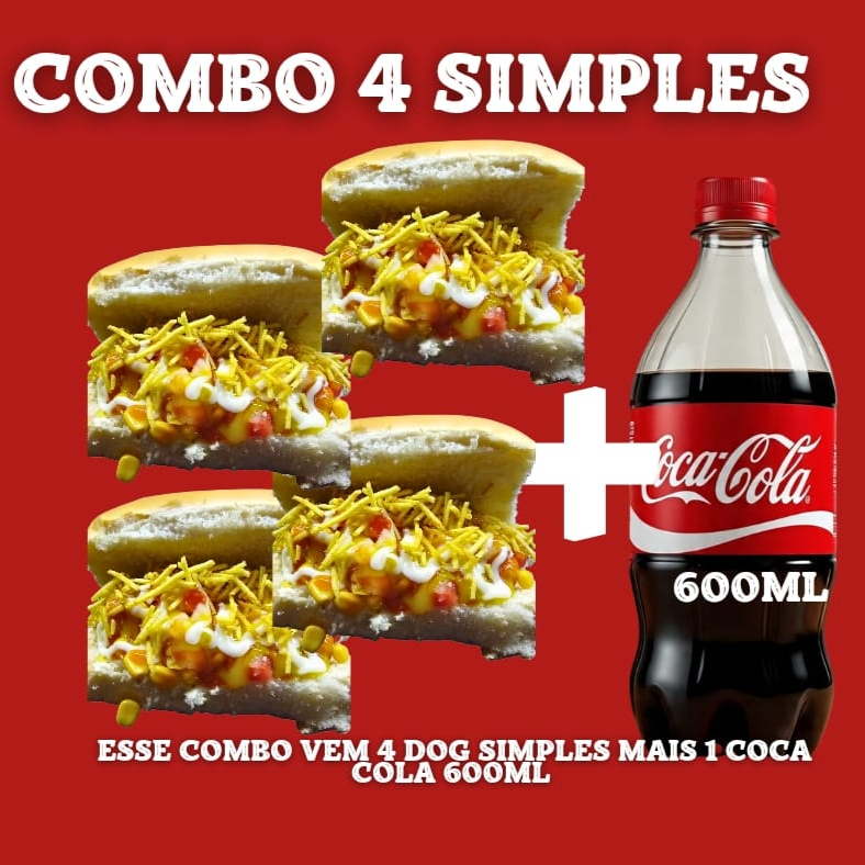 007- Combo 4 Hot Dog Simples Pão Médio + 1 Refrigerante 600 Ml