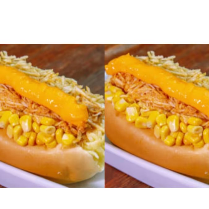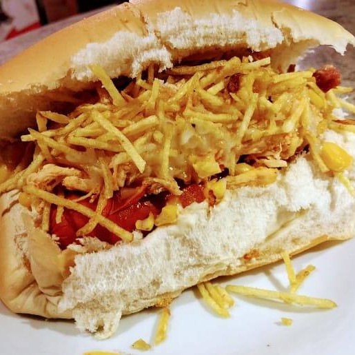 Pão, maionese, 2 salsichas, frango desfiado, cheddar, tomate, cebola, milho, batata palha