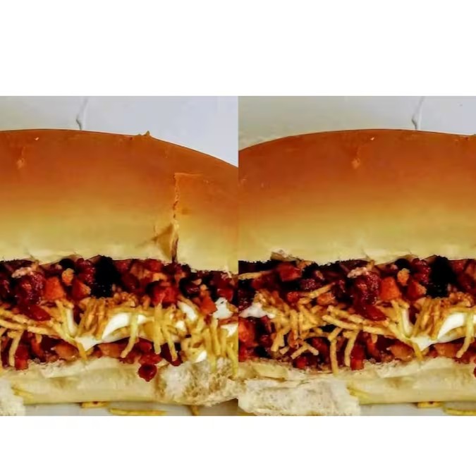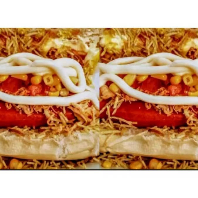 Pão, maionese,2 salsichas, calabresas, Catupiry, tomate, cebola, milho, batata palha