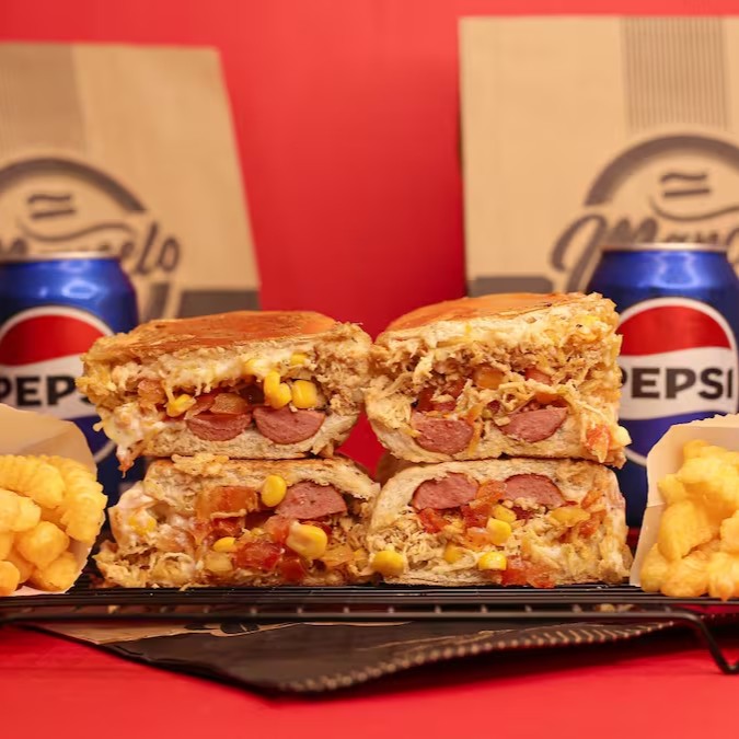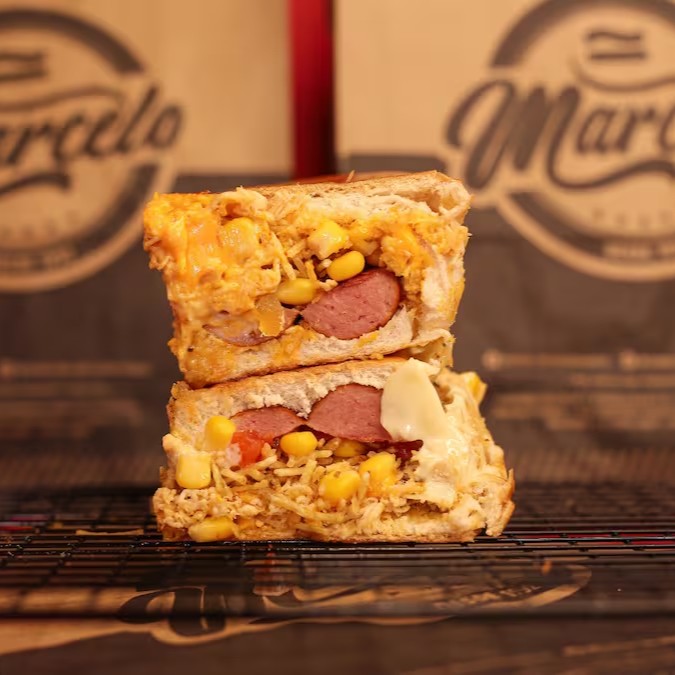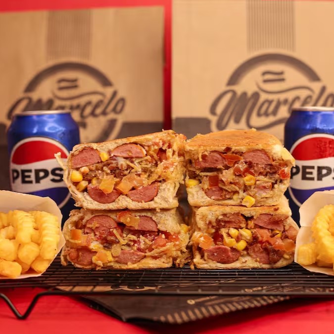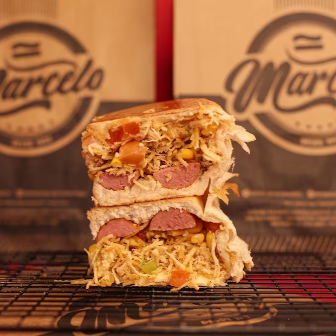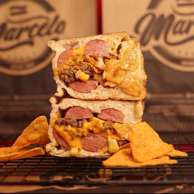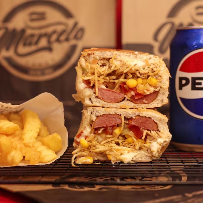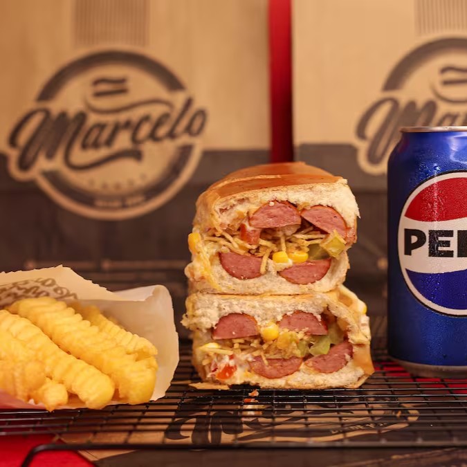 Pão, 2 Salsichas Perdigão, carne moida temperado (levemente apimentada), cheddar cremoso, Milho, Doritos e a Famosa Maionese do Marcelo.
