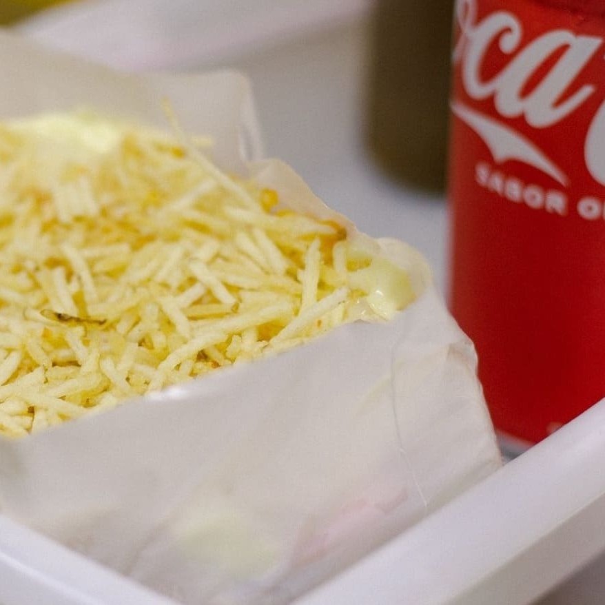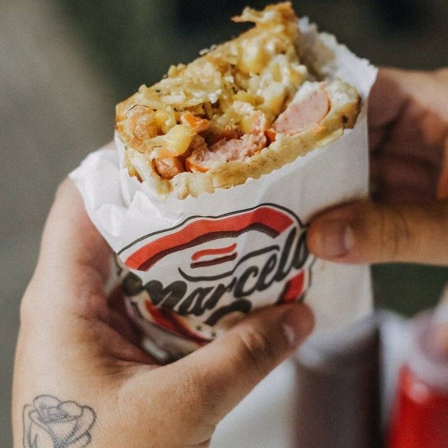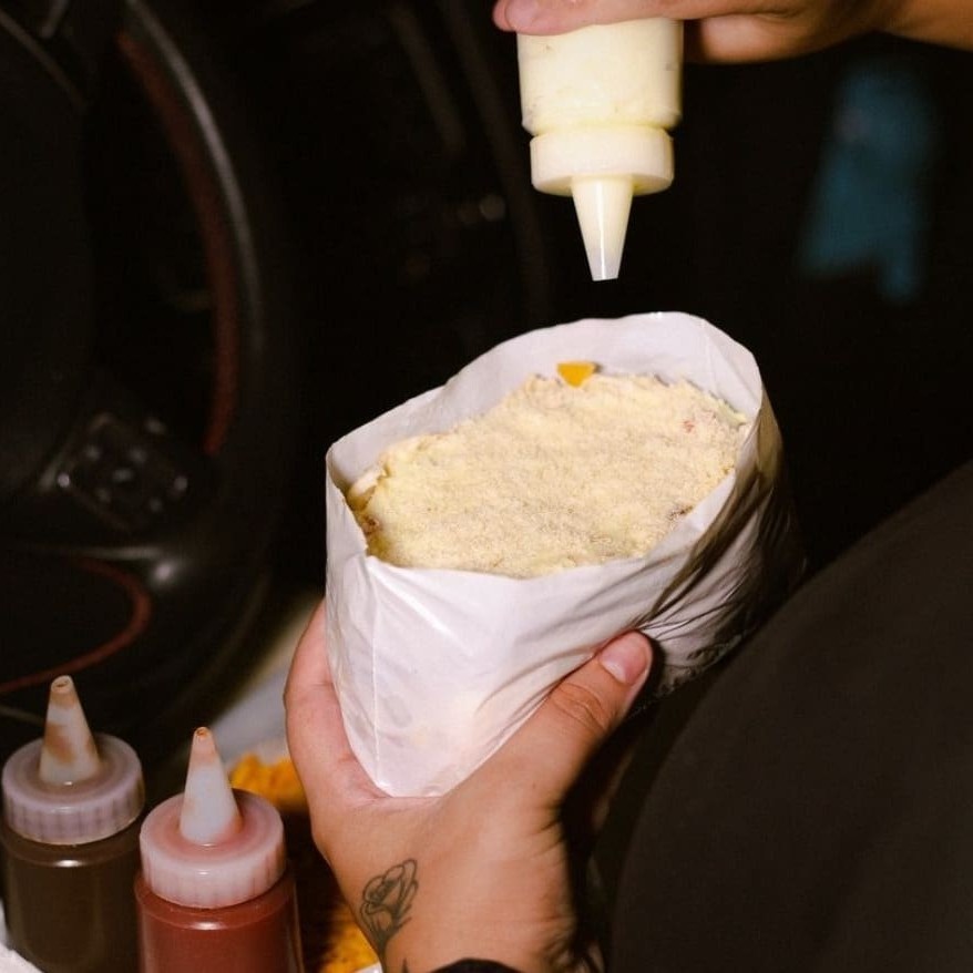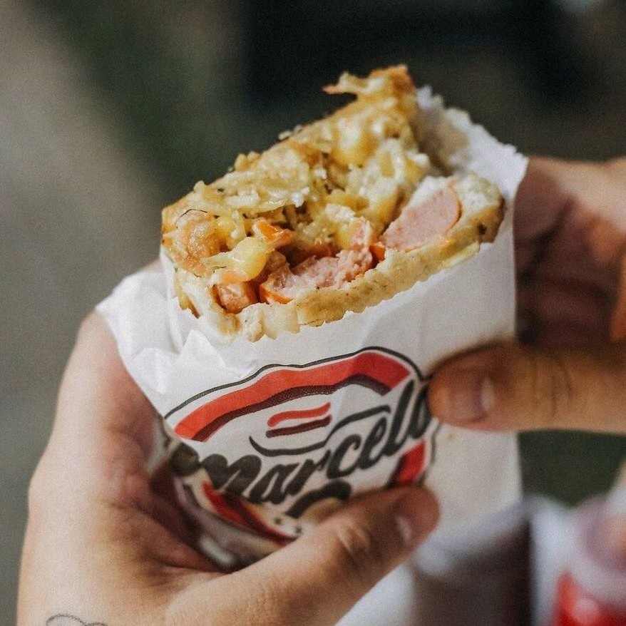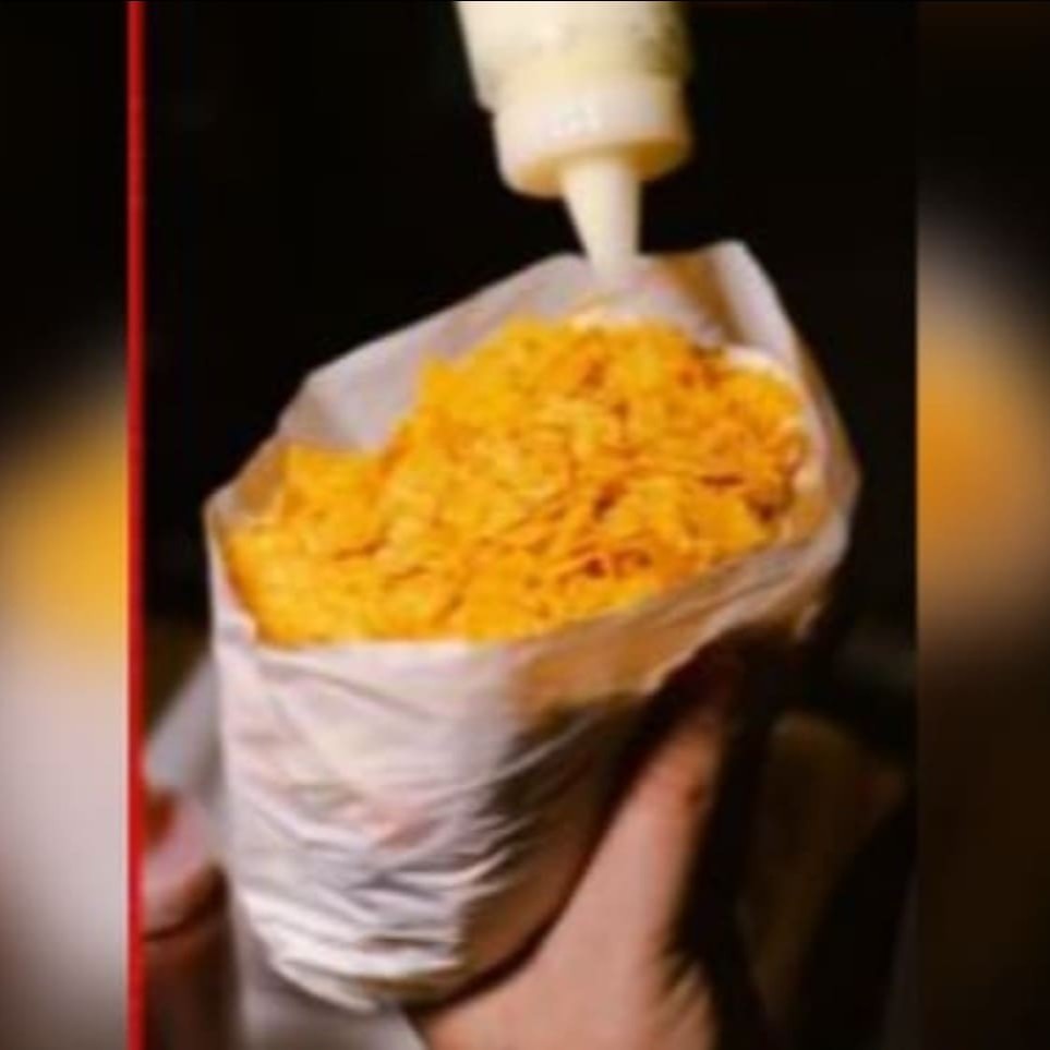 Pão, 2 vinas, carne moída, cheddar, milho, maionese e Doritos.