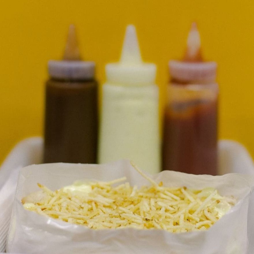 Pão, vina, bacon, Catupiry, tomate, milho, bacon, batata palha, maionese e queijo ralado.