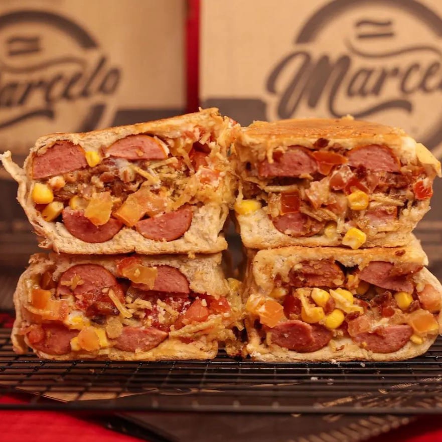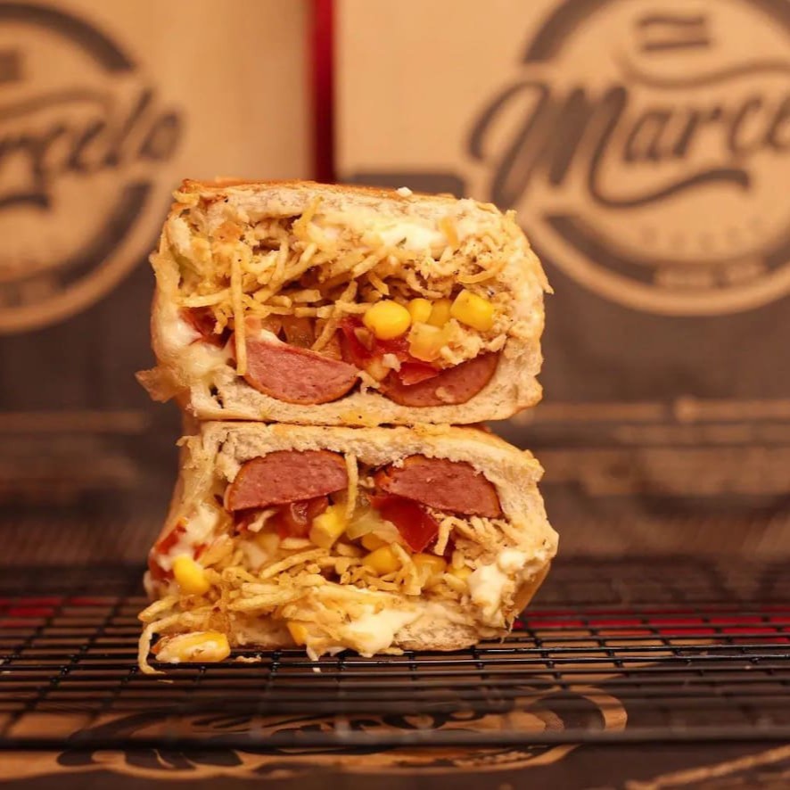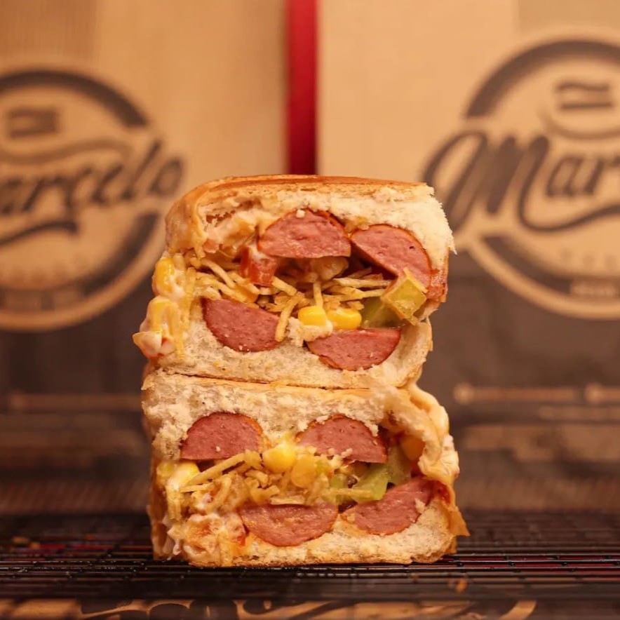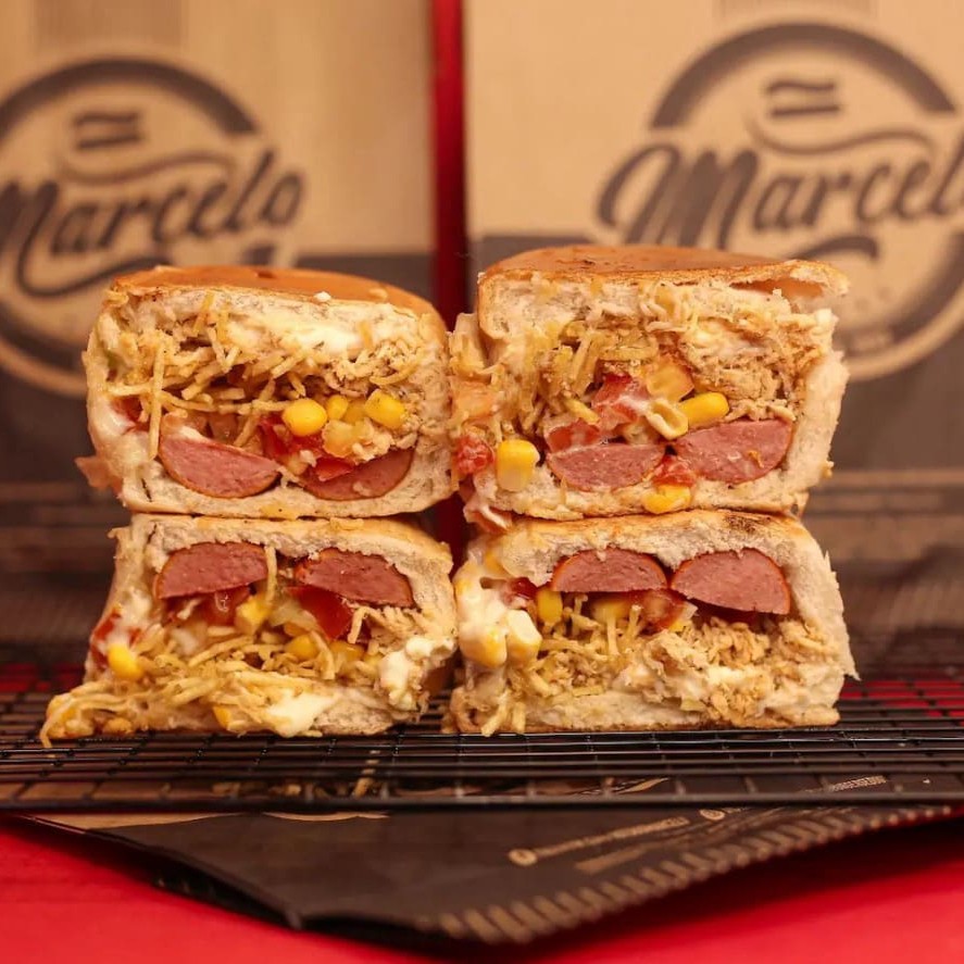 Pão, 2 Salsichas Perdigão, carne moida temperado (levemente apimentada), cheddar cremoso, Milho, Doritos e a Famosa Maionese do Marcelo.