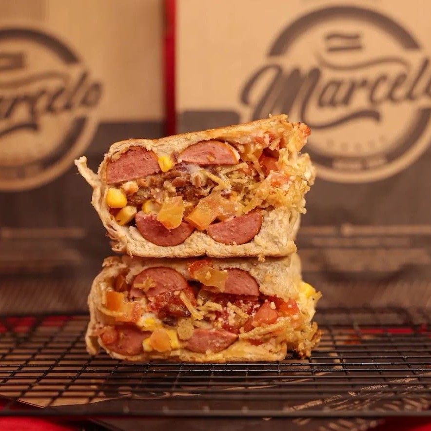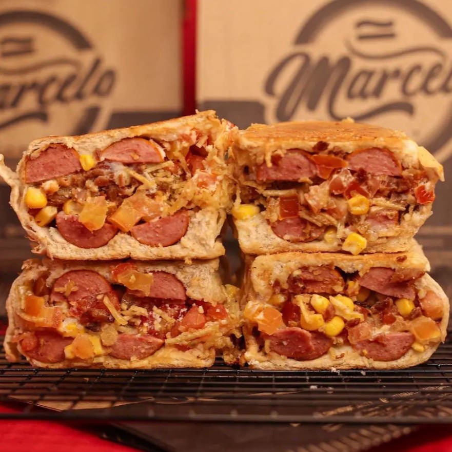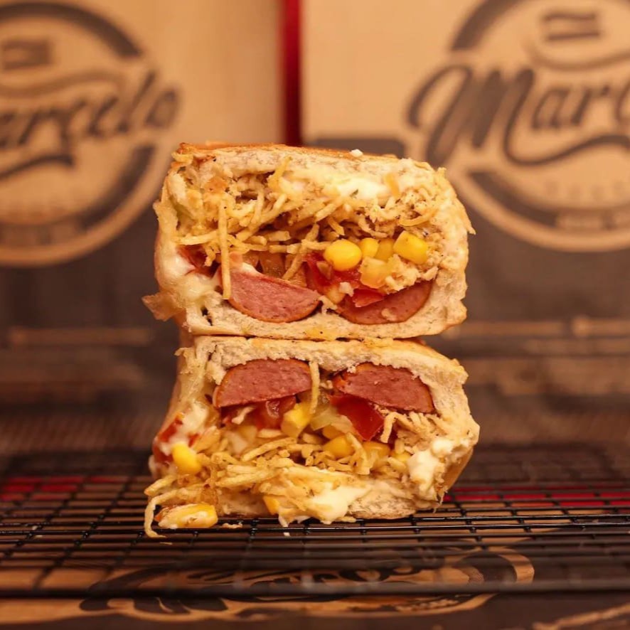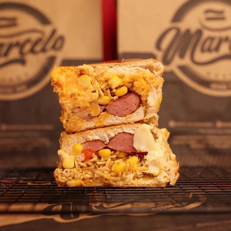 Pão, 2 Salsichas Perdigão, carne moida temperado (levemente apimentada), cheddar cremoso, Milho, Doritos e a Famosa Maionese do Marcelo.