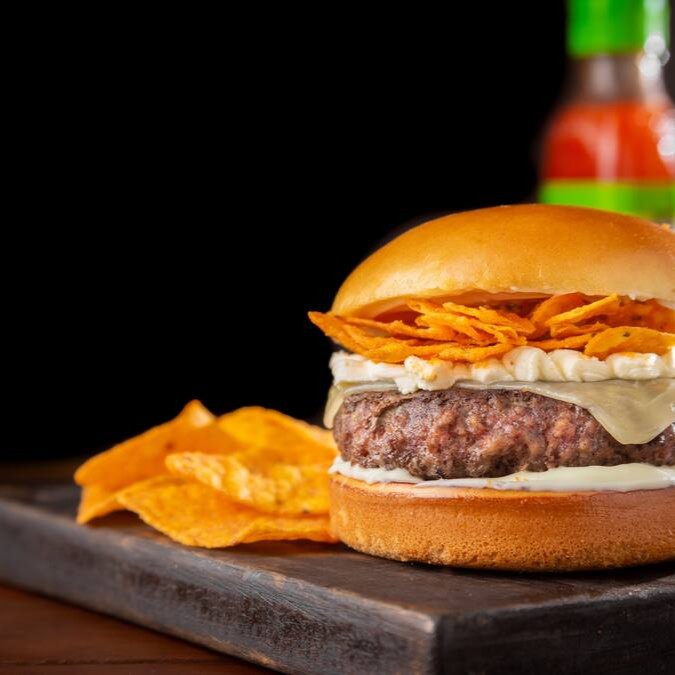 Apresentamos o irresistível 'Doritos Hambúrguer', criado especialmente para os verdadeiros amantes de Doritos. Este hambúrguer é feito com um suculento e generoso hambúrguer de 150 gramas, acentuado pelo delicioso queijo derretido. É servido em um pão de brioche fresco e macio, e complementado com nossa maionese especial, que adiciona uma pitada de sabor único. Mas o verdadeiro protagonista é o crocante e inconfundível Doritos, que dá um toque final de sabor explosivo. Para tornar a experiência ainda mais saborosa, enviamos uma porção extra de Doritos à parte. Desfrute desta edição especial da nossa categoria de hambúrgueres!