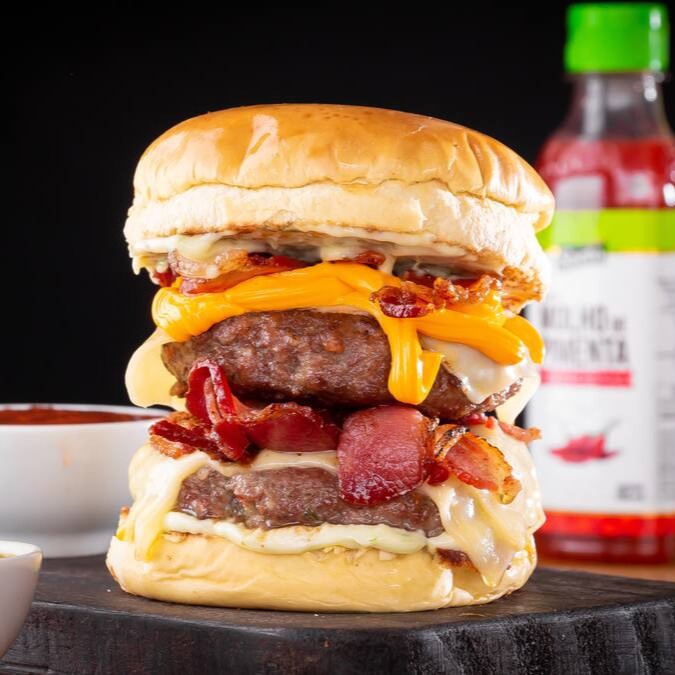 Pão de Brioche, 2 hamburguers de 150 gramas, bancon, queijo, cheddar e super maionese especial Ibaiti.