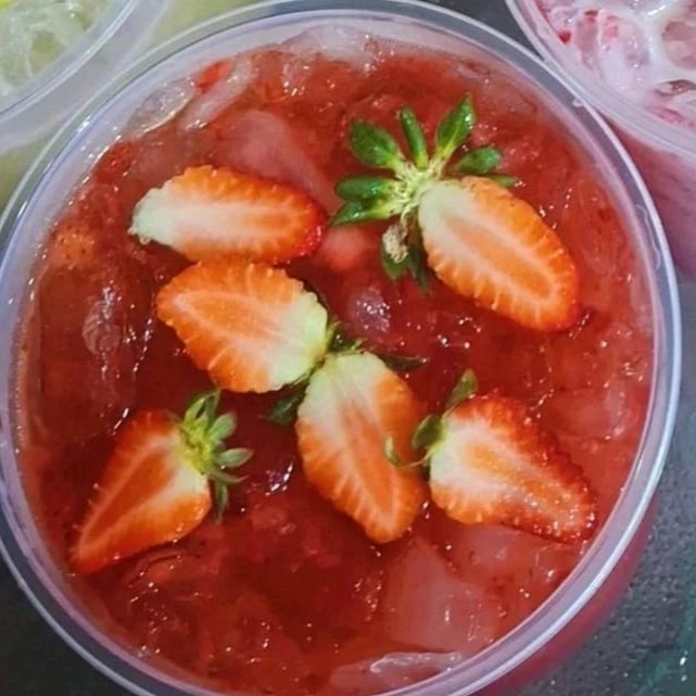 Caipirinha preparada com morango, gelo potável, doses de Velho Barreiro. Balde 1.5lt
