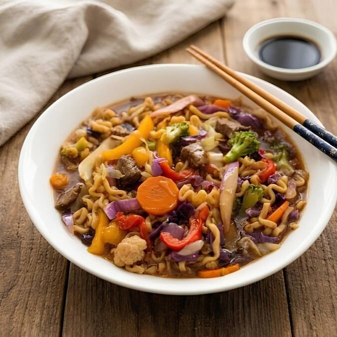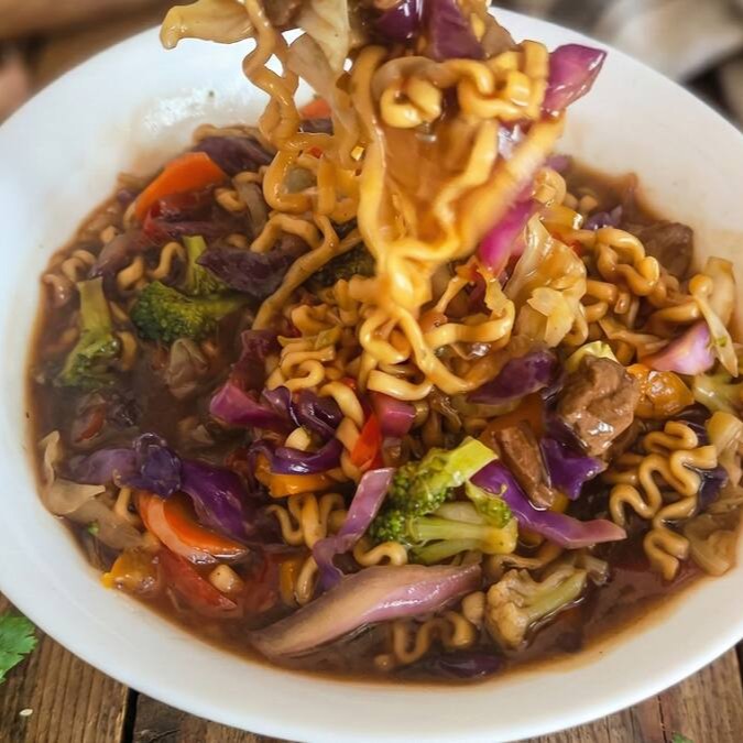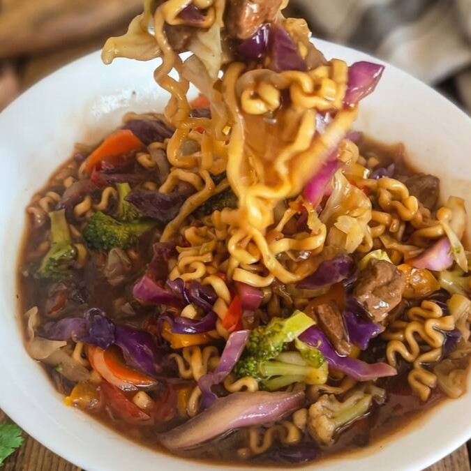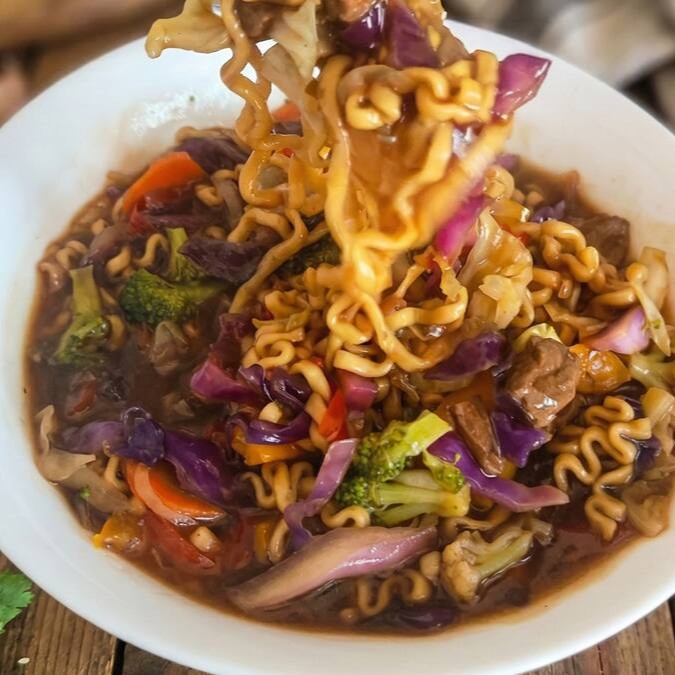 Nosso Yakisoba de Carne é feito com macarrão oriental, com pedaços de Carnes suculentas, acompanhado de legumes frescos como brócolis, couve-flor, cenoura, repolho, pimentão vermelho, pimentão amarelo e finalizado com um molho à base de shoyu e tempero do chef.