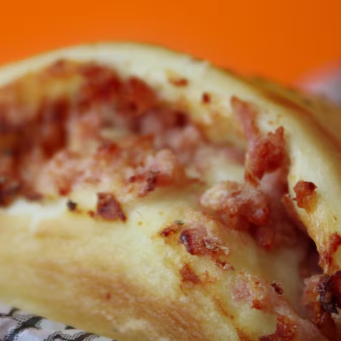 Salgado em formato de meia-lua recheado com calabresa e queijo