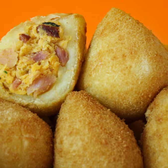 Salgado tradicional brasileiro de massa de farinha de trigo com recheio de frango e bacon