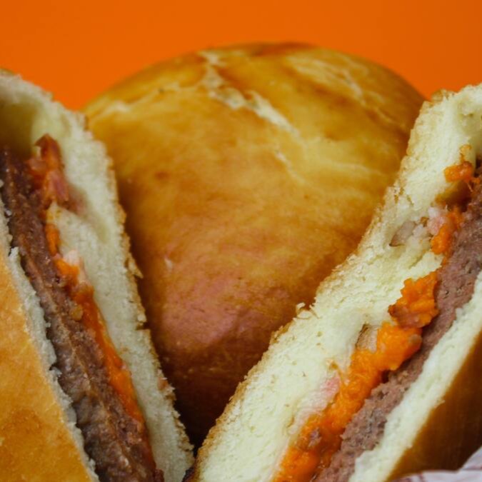 Hambúrguer assado estilo hamburgão com queijo e presunto.
