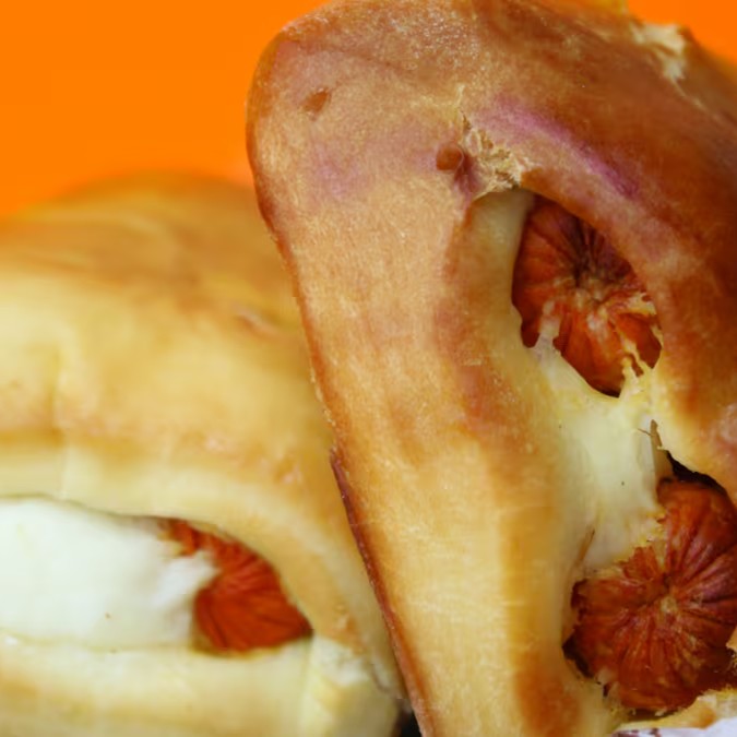 Salgado enrolado com massa de farinha de trigo e recheio de salsicha