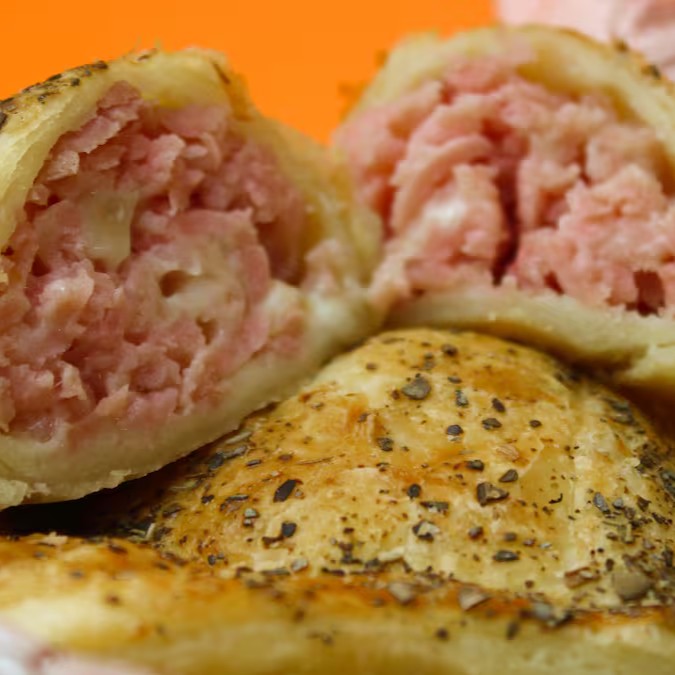 Folhado assado com queijo e presunto.