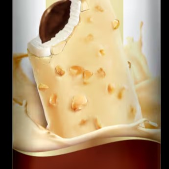Sabor leite com recheio palito de chocolate, coberto com casquinha de chocolate branco com amendoim.