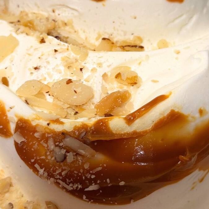Gelato cremoso de nata, recheado com doce de leite e castanhas crocantes. Um sabor suave, elegante e surpreendente — a verdadeira “belga” que conquista sem usar uma gota de chocolate.
