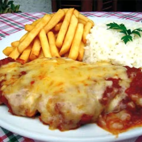 Arroz, batata frita, bife a milanesa coberto com molho ao sugo e queijo. aprox750g